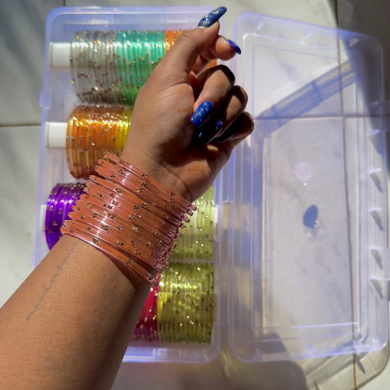 Introducing our gorgeous "Coral Reef Pink" Glass Bangles with Stone Detailing - a beautiful set of 12 bangles. This stack is perfect for the glam bangle squad. Made with colorful glass, these bangles are stunning for festive wear, weddings and oh so dreamy.