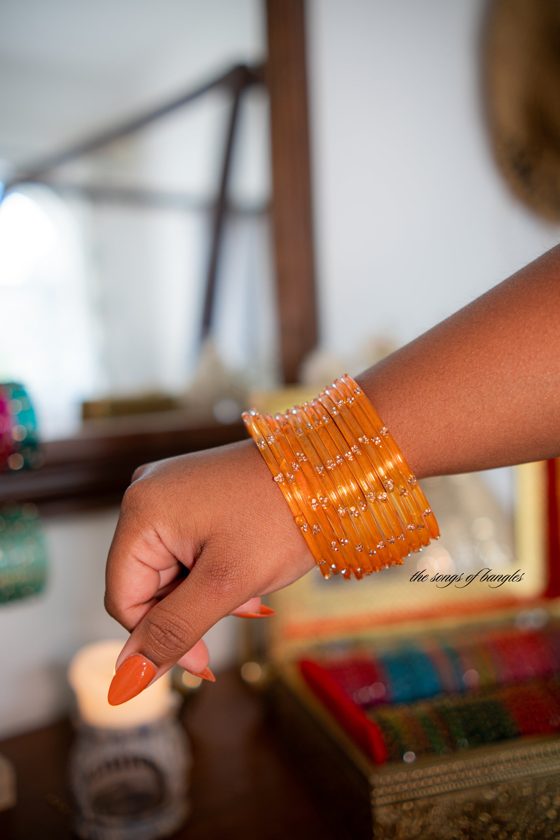 Introducing our gorgeous VIRAL "Marigold Fire Orange" Glass Bangles with Stone Detailing - a beautiful set of 12 bangles. This stack is perfect for the glam bangle squad. Made with colorful glass, these bangles are stunning for festive wear, weddings and oh so dreamy.